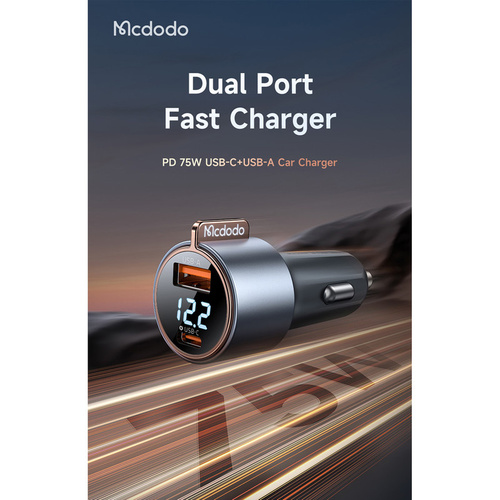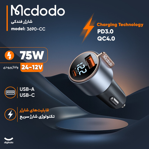 شارژر فندکی 75وات مک دودو مدل CC-3690 ساخته شده از آلیاژ آلومینیم و مواد PC+ABS علاوه بر ظاهر شکیل دارای استحکام مناسبی میباشد.این فندکی دارای دو خروجی USB و تایپ سی با توان خروجی مجموع 75 وات است که سهم تایپ سی 45 وات و USB توان 30 وات را پشتیبانی میکند.این فندکی از پروتکل های شارژ سریع PD3.0/ PPS/ QC4+/ QC3.0/ AFC/ FCP/ SCP/ SFC2.0/ BC1.2/Samsung/Apple 2.4A انواع موبایل و تبلت (بسته به قابلیت دستگاه و کابل مورد استفاده) پشتیبانی می نماید.این شارژر فندکی دارای نمایشگر ولتاژ میباشد که سهولت کار در تاریکی خودرو را نیز فراهم میکند.از شارژر فندکی 75وات مک دودو در انواع خودرو سواری و کامیون و اتوبوس می توان استفاده نمود.ساپورت ولتاژ ورودی DC 12V-24V از ویژگی های این فندکی است.
