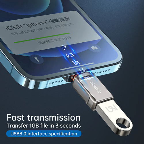 مبدل OTG USB به لایتنینگ مک دودو مدل OT-8600،این تبدیل از بدنه فلزی با آلیاژ ZINC سند بلاست شده ساخته شده است،که سبب طول عمر بسیار بالای این تبدیل شده است.دارای قابلیت Plug & Use : بعد از اتصال فلش یا هارد دیسک اپلیکیشن “Documents” را در موبایل باز میکنید و نام هارد و فلش خورد را پیدا کرده و عملیات انتقال و کپی فایل رو انجام می دهید و علاوه بر این می توانید در پوشه Files نیز در بخش Browse فلش و هاردی را که به این مبدل متصل نمودید را یافته و اطلاعات را از فلش به موبایل یا بالعکس انجام دهید.همچنینی امکان اتصال موس یا کیبرد را دارید.با این مبدل امکان پخش فیلم و عکس از روی فلش یا هارد (حداکثر 2 ترابایت) را دارید.امکان شارژ همزمان یا انتقال دیتا را نیز با اتصال کابل شارژ به پورت لایتنینگ مبدل دارید.