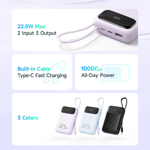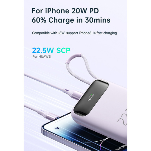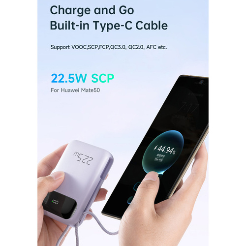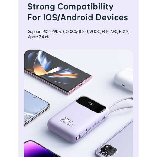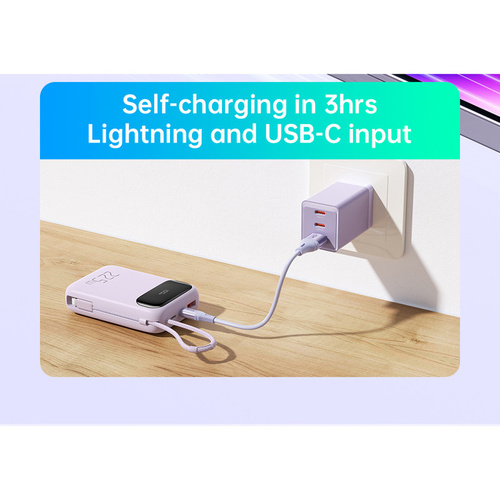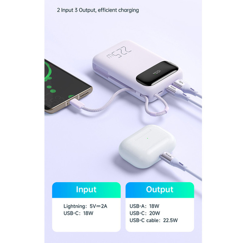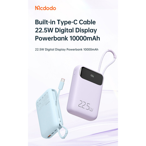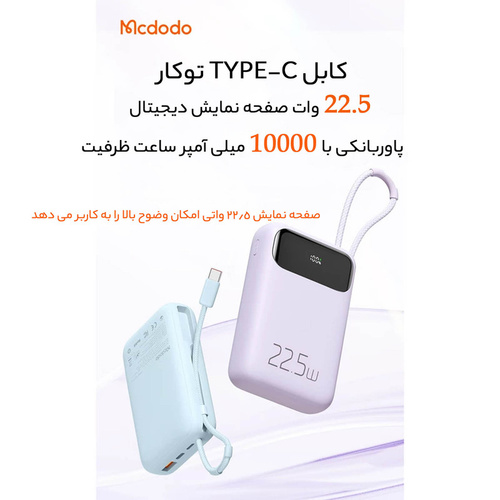 پاوربانک مک دودو 22.5W مدل MC-324 ظرفیت 10000 میلی آمپر ساعت با توان 22.5 وات دارای قابلیت فست شارژ آیفون و اندرویدی است و امکان شارژ 3 دستگاه همزمان را دارد.دارای 3 خروجی که شامل یک پورت USB و یک پورت تایپ سی و کابل تایپ سی متصل به بدنه میباشد.پورت ورودی جهت شارژ پاوربانک یک پورت لایتنینگ و پورت تایپ سی میباشد.این پاوربانک از پروتکل های شارژ سریع PD3.0/QC3.0/SCP/FCP/AFC/VOOC/Apple را دارد و با انواع برندها سازگار است.زمان شارژ این پاوربانک با شارژر 25/33W تایپ سی PD و کابل تایپ سی توان بالا حدود 3 ساعت خواهد بود.طراحی بسیار شیک و مینیمال و لاکچری و اسلیم از ویژگی های این پاوربانک است.انتقال حرارت بسیار عالی و عدم تجمع حرارت نیز از خصوصیات MC-324 است.این پاوربانک با رنگهای بنفش،آبی و مشکی عرضه شده که با کدهای MC-3240/MC-3241/MC-3242 تفکیک می گردند.پاوربانک دارای تراشهای هوشمندی است که با 9 قابلیت محافظتی ، محافظت کامل از دستگاه در برابر اتصال کوتاه ، نوسانات آمپر و ولتاژ و نوسان حرارت بعهده داشته و میزان جریان و ولتاژ لازم برای هر دستگاه را بصورت اتومات و سریع تشخیص میدهد.دارای صفحه دیجیتال نشانگر درصد شارژ پاوربانک و فست بودن است.این پاوربانک از پروتکل های بین المللی حالت پرواز پشتیبانی نموده و قابلیت استفاده در هواپیما را نیز دارد.دارای ابعاد 10.3cmx6.73cmx2.63cm است.
